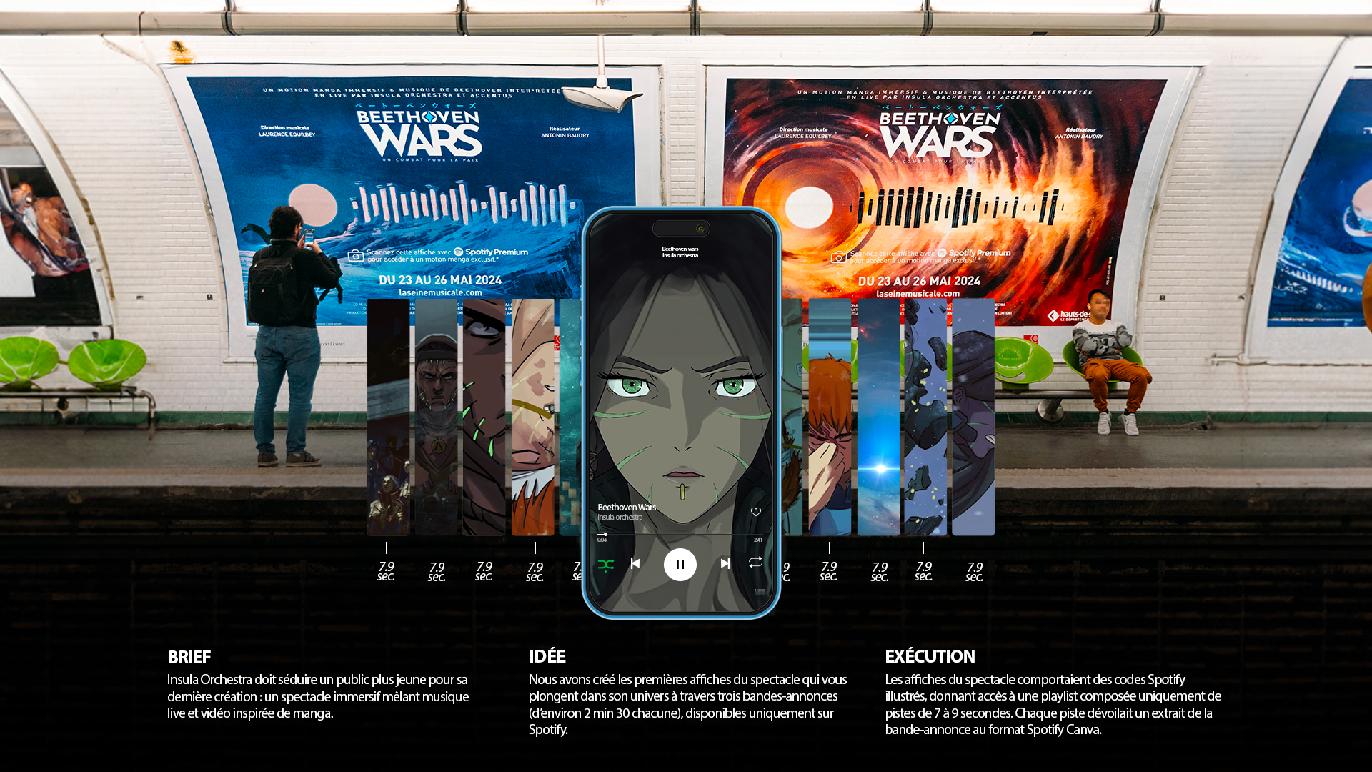 En intégrant un Spotify code illustré directement dans les affiches du spectacle. En scannant le visuel, l’utilisateur est renvoyé vers la playlist d’Insula orchestra où la vidéo vient compléter la musique et offre une séquence inédit.